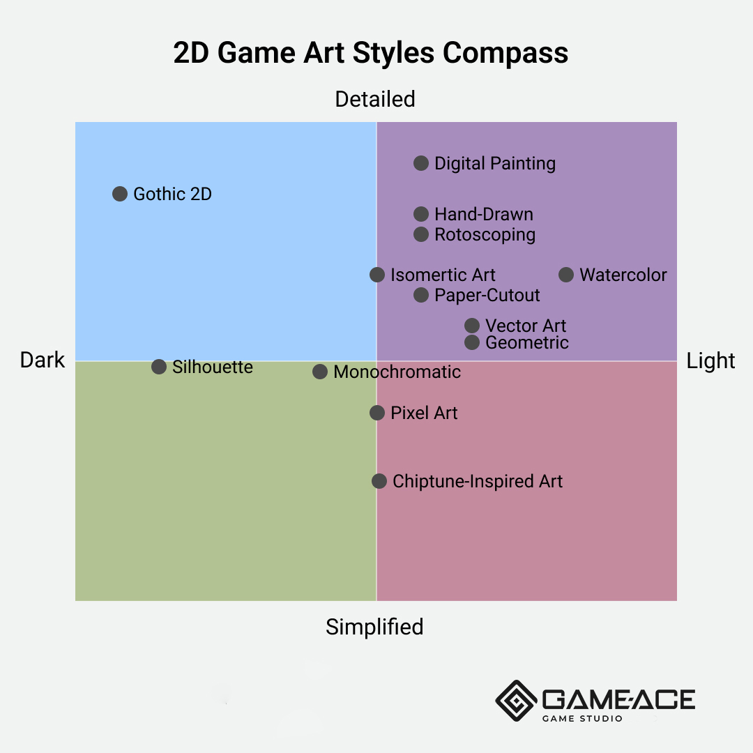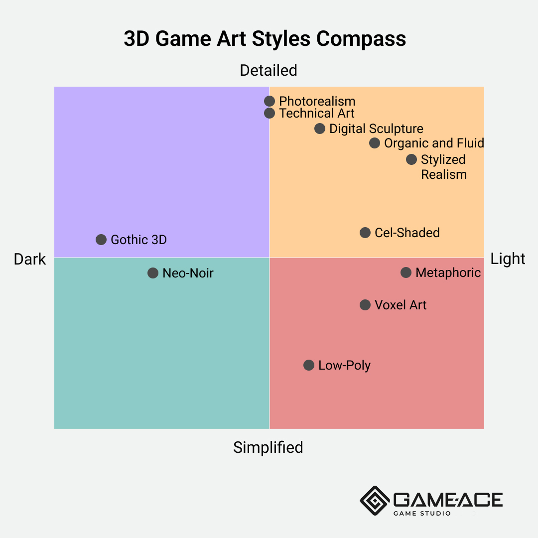 Please note that art styles can be used in various ways, and this infographic is based on typical uses of these styles. Different games may use the same style but position differently on the compass based on their narrative and atmosphere.
